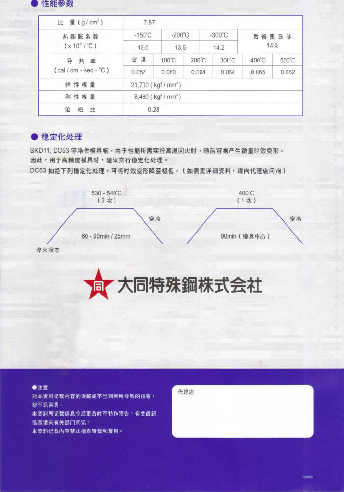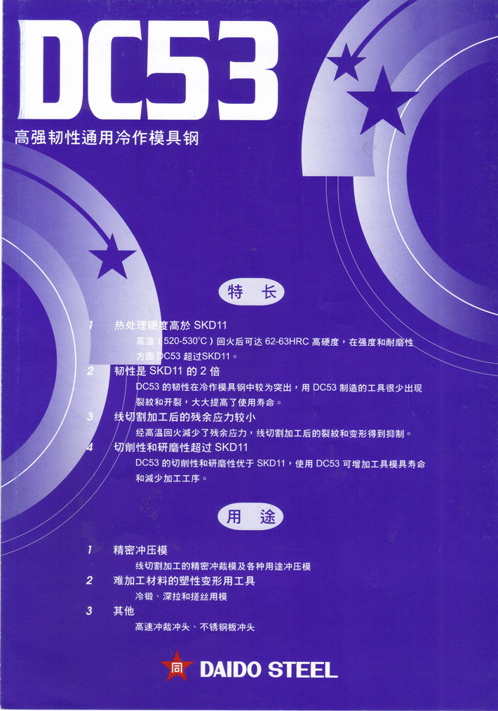 日本大同特殊鋼DC53高韌性模具鋼:8%Cr 高硬度*高韌性模具鋼