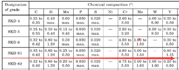 SKD61屬于日標(biāo)熱作模具鋼,執(zhí)行標(biāo)準(zhǔn):JIS G4404-2006
